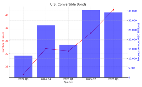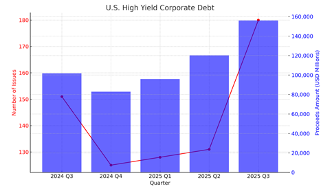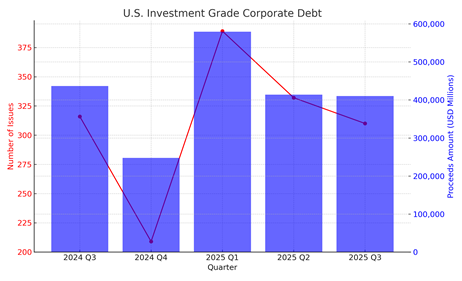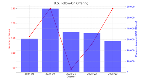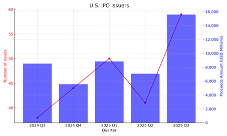 The below market snapshot shows the volume of U.S. IPOs, follow-on offerings, investment grade corporate debt issuances, convertible bonds issuances and high-yield corporate debt issuances from the third quarter of 2024 through the third quarter of 2025.