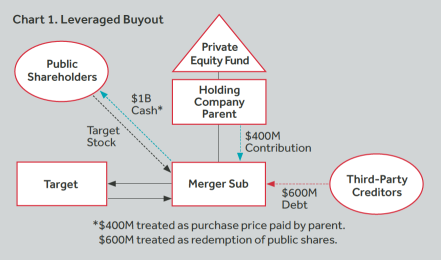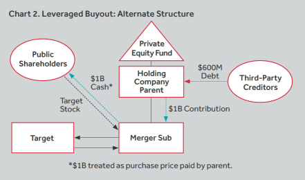 In the classic leveraged buyout structure of a U.S. public company, the acquirer first sets up a corporate merger subsidiary. Immediately prior to the transaction, the merger sub is capitalized with cash equity and borrows to finance the remaining portion of the purchase price. The cash provided to the merger sub through equity and debt is then used to acquire the shares of the target held by the public. The merger sub and public target combine, with the public company “continuing” as a result of the merger and the merger sub ceasing to exist as a separate entity. The private equity fund’s holding company then becomes the owner of the continuing company. By operation of law, the continuing company succeeds to the assets and liabilities of both the former public target and the merger sub—which, importantly, includes the debt incurred by the merger sub to finance part of the acquisition.