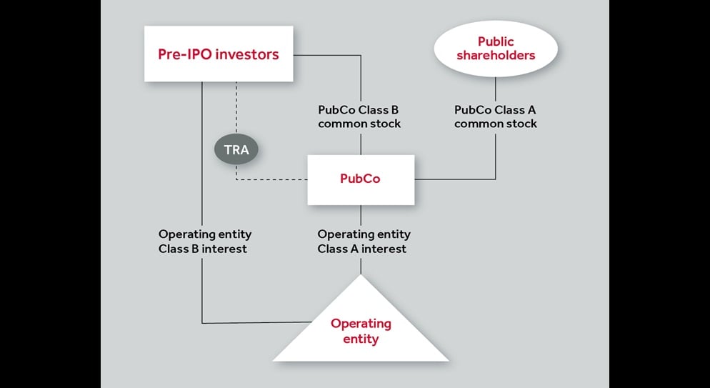 In the IPO, PubCo issues two types of shares: (1) Class A common stock, which is issued to public investors and carries the economic entitlements of ownership in PubCo but only a small percentage of voting rights; and (2) Class B common stock, which is issued to pre-IPO investors and carries a majority of the voting rights in PubCo, but no economic rights (as these investors continue to hold their economic interests via units in the operating pass-through entity).