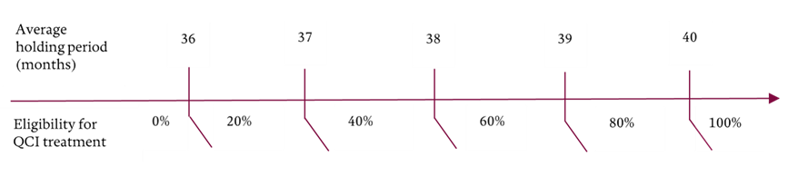 Similarly to the current IBCI rules, the QCI rules provide that if a fund’s average holding period is greater than 40 months, the carried interest is QCI, with a sliding scale if the average holding period is between 36 and 40 months, as illustrated below.