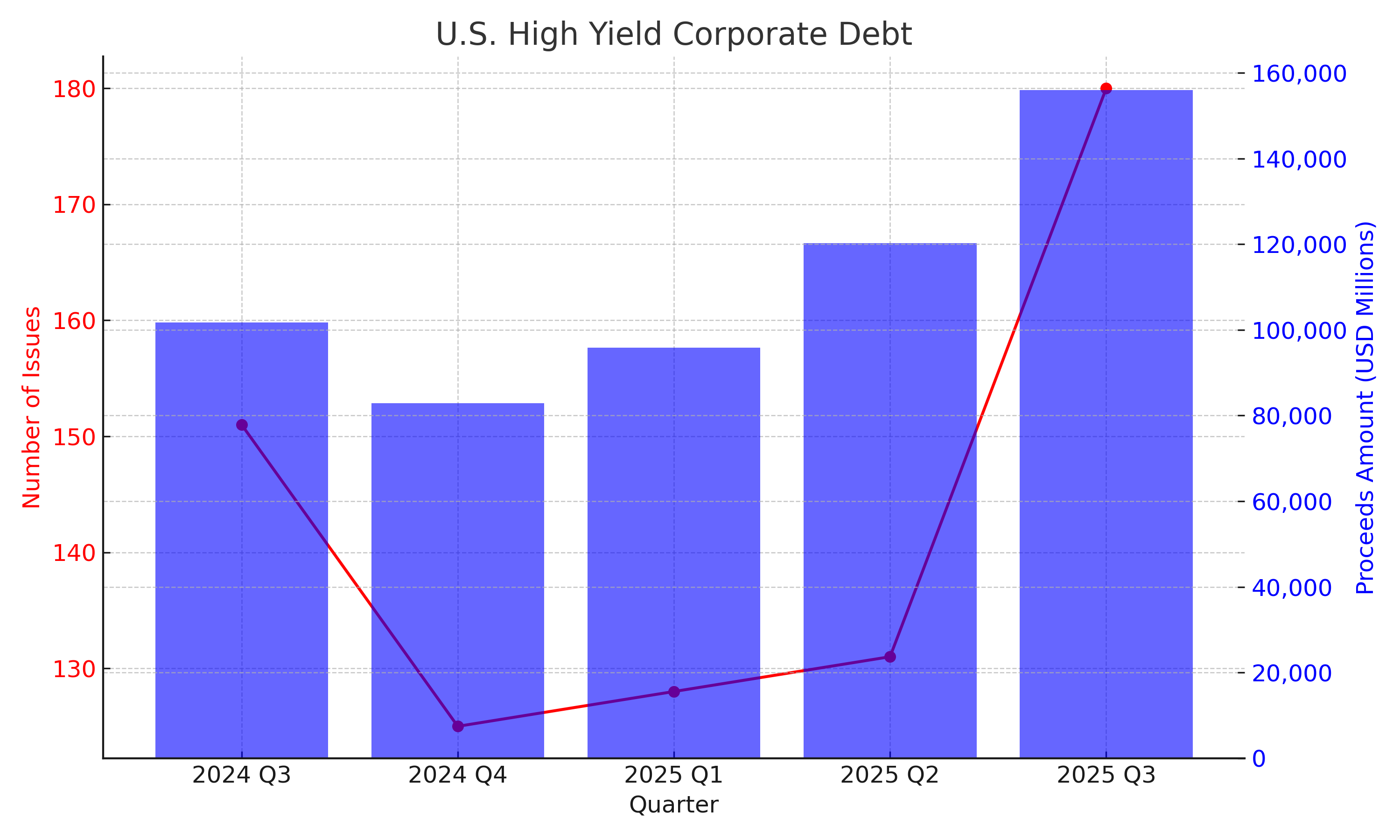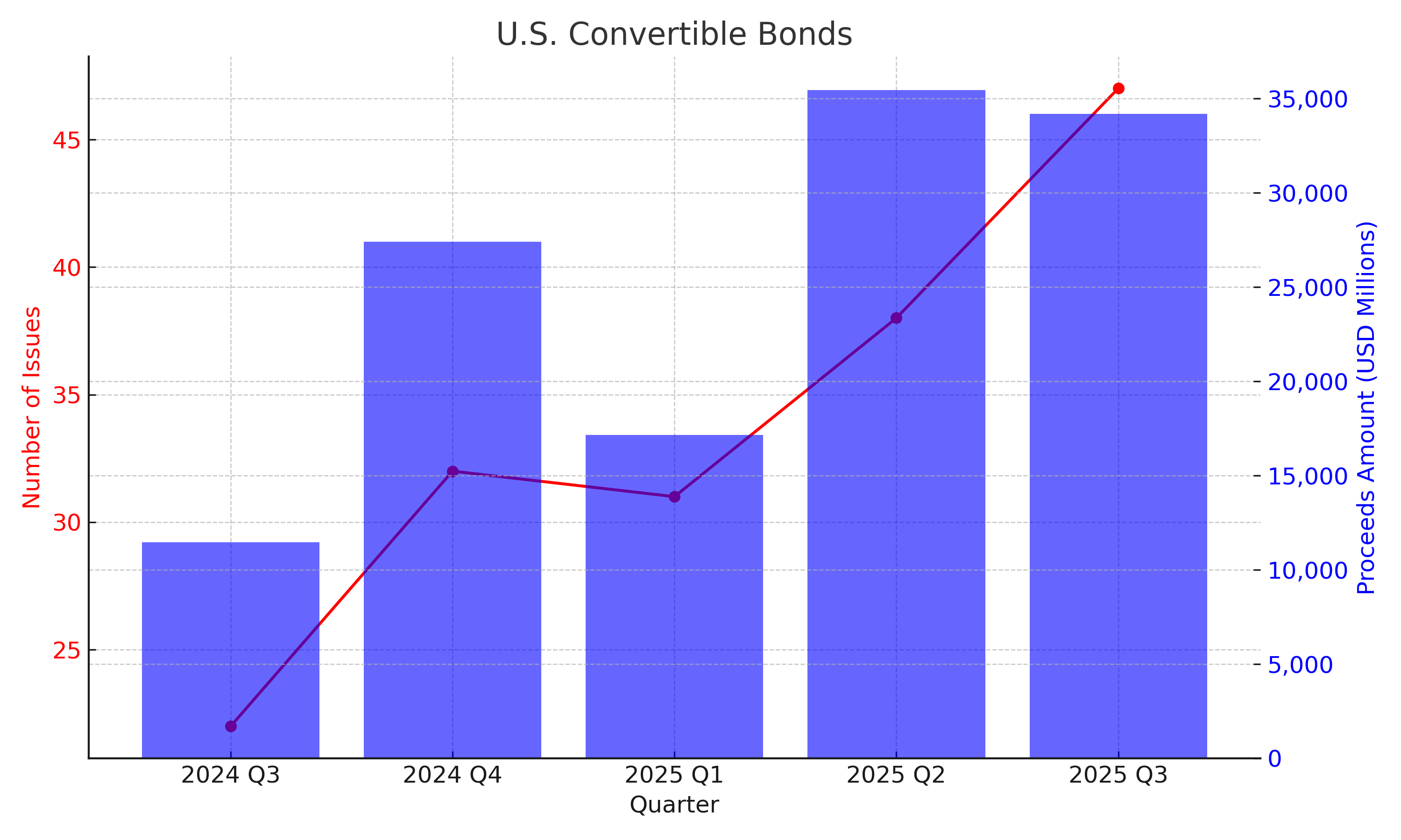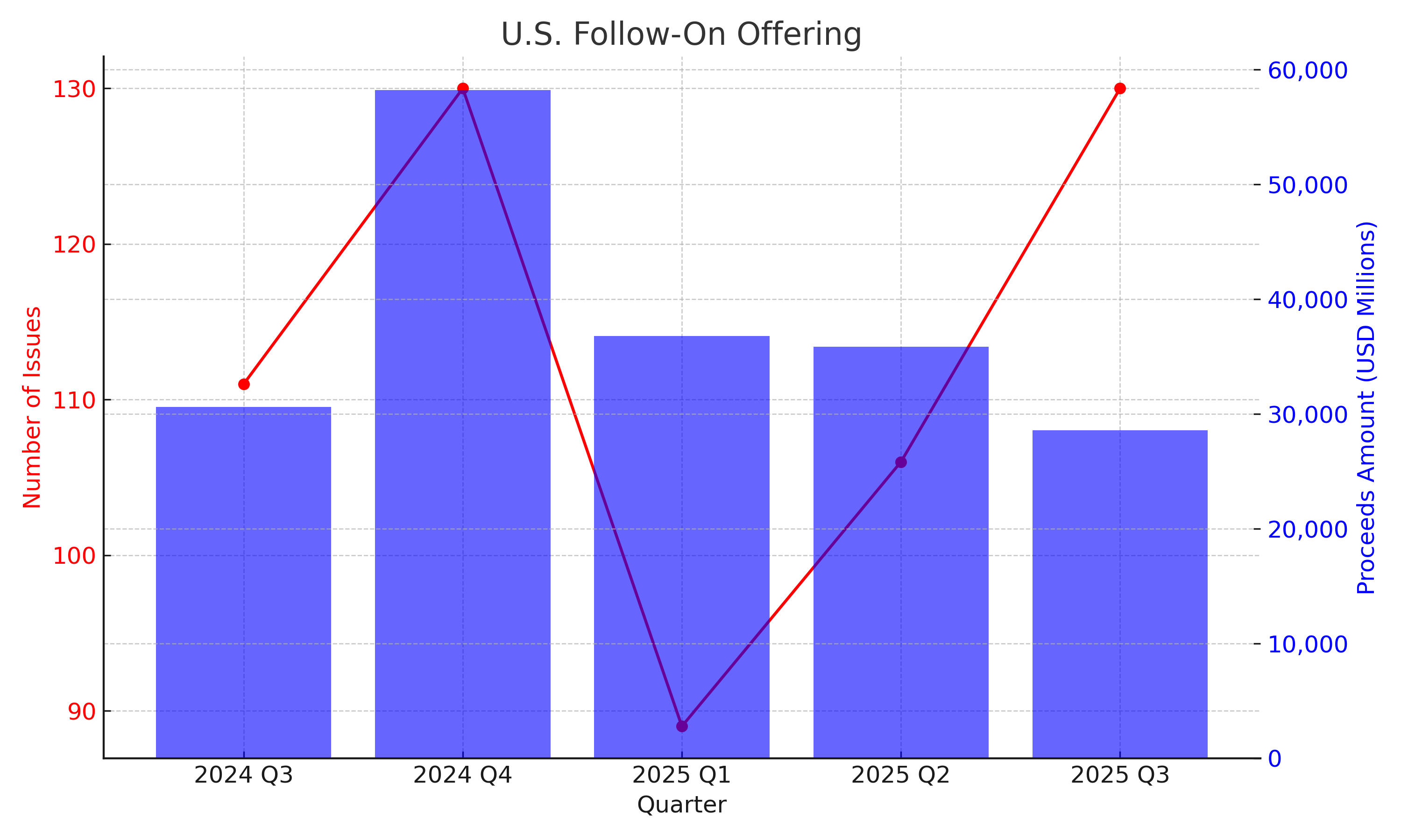 The below market snapshot shows the volume of U.S. IPOs, follow-on offerings, investment grade corporate debt issuances, convertible bonds issuances and high-yield corporate debt issuances from the third quarter of 2024 through the third quarter of 2025.