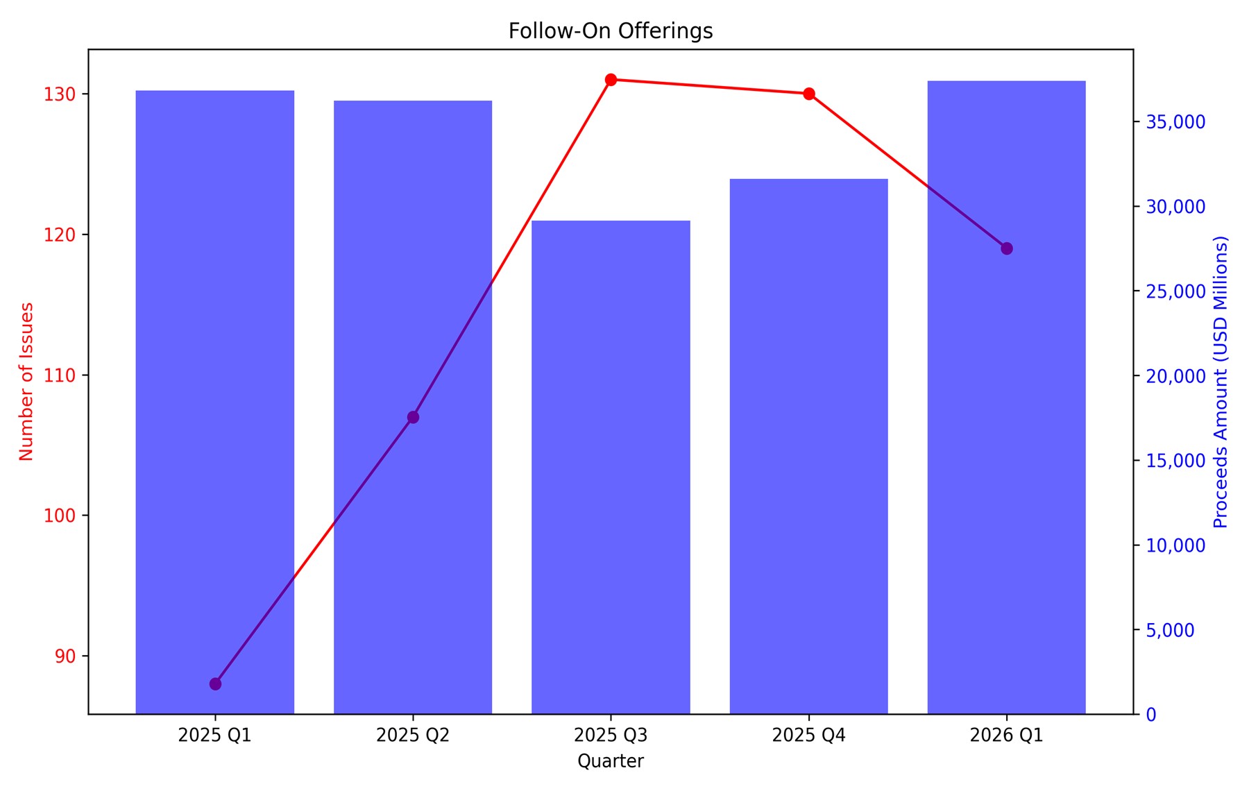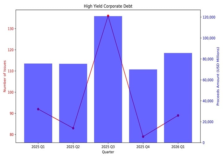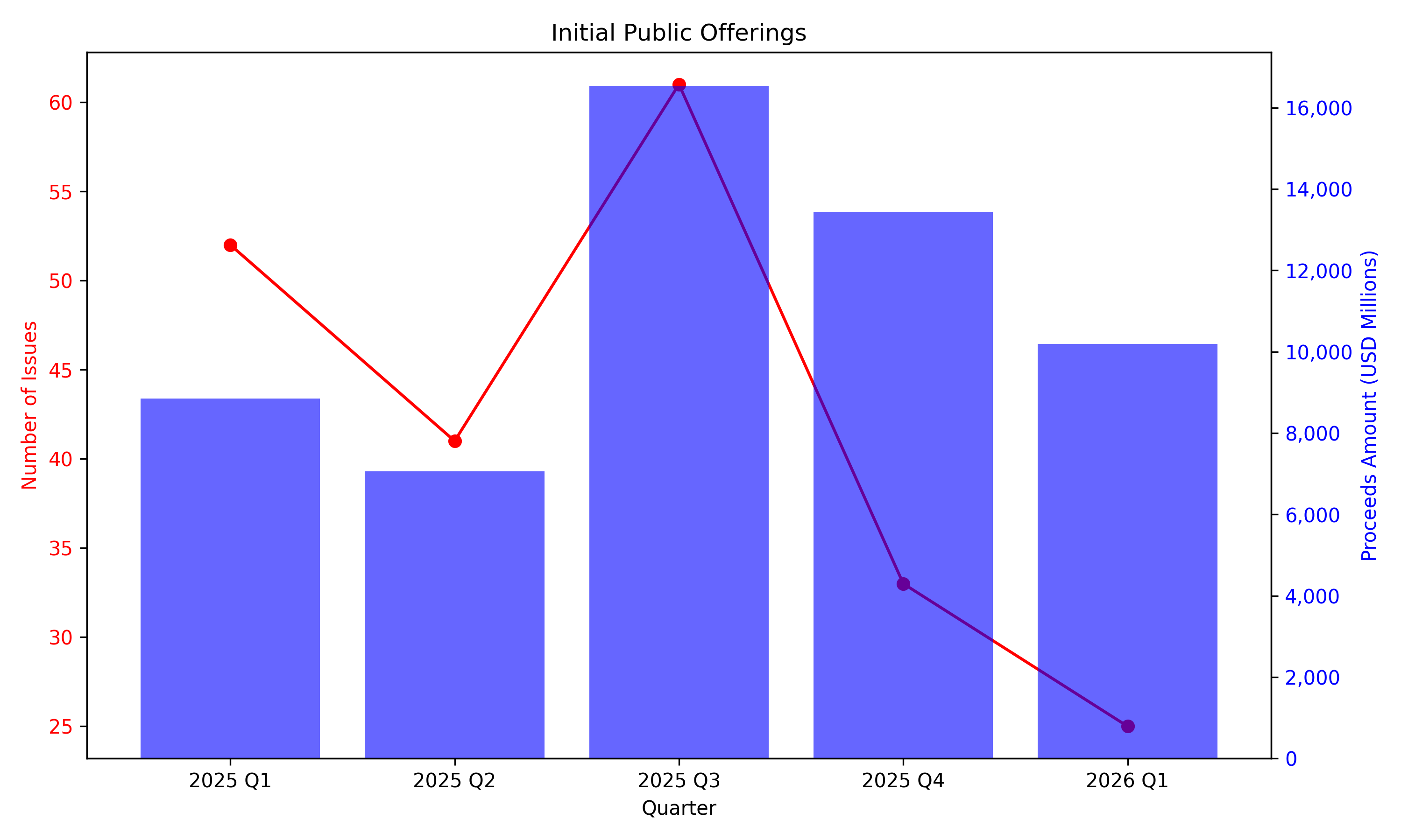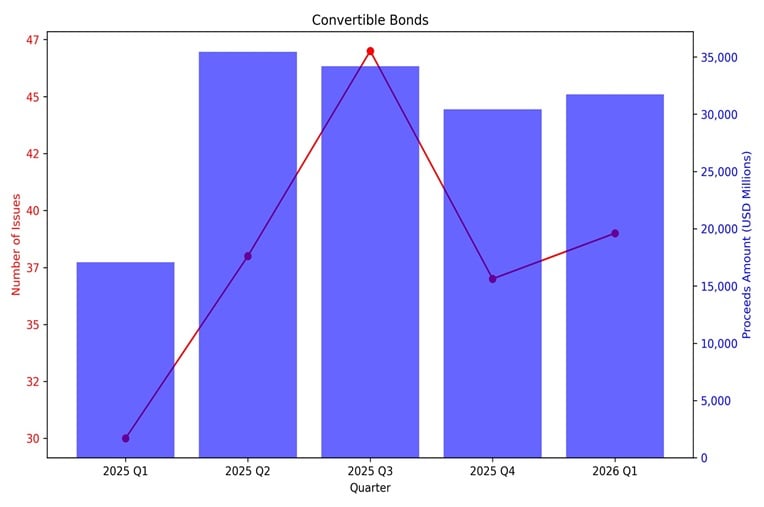 The below market snapshot shows the volume of U.S. IPOs, follow-on offerings, investment grade corporate debt issuances, convertible bonds issuances and high-yield corporate debt issuances from the first quarter of 2025 through the first quarter of 2026.